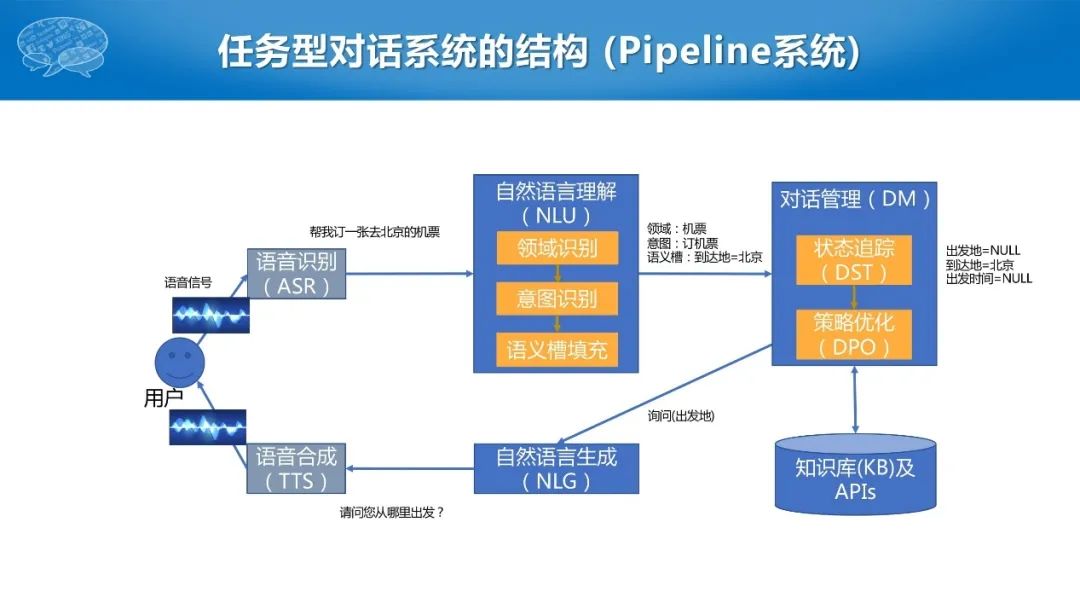 首先,用户发出一个语音信号,通过语音识别转化为自然语言的文本,比如“帮我订一张去北京的机票”,接着进行自然语言的理解,包括领域和意图的识别、以及语义槽的填充,比如这句话的领域是机票、意图是订机票、语义槽是到达地等于北京。然后,这项结果传递给下一个步骤,即对话的管理。第一步是状态跟踪,第二步是策略优化,这些都涉及知识库以及一些API的调用。最后,生成自然语言比如“请问您从哪里出发”,经过TTS返给用户,流程不断循环并逐步完善用户的对话状态,最终实现用户查询。