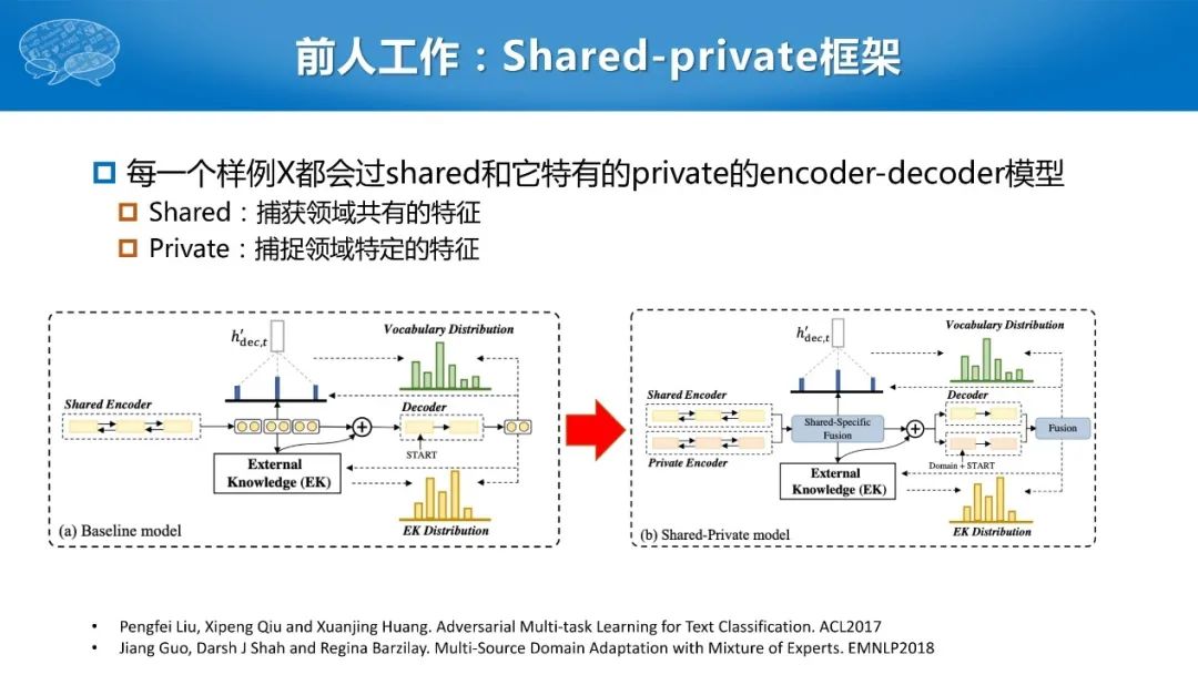 一种最简单的方法就是把多个领域的数据进行混合来共同训练,但是这样简单地共享一套参数难以捕获所有领域的特征,从而忽略了领域之间独有的特点。前人的一个方法叫做共享-私有框架,就是把这些数据混合、变成共享的模块,再针对每个领域做私有的模块。但是,这种encoder和decoder的方法仍然是将每个领域逐个利用,忽略领域之间的细粒度关系,缺少领域之间交互的信息。