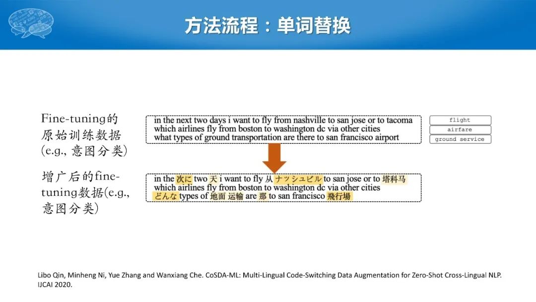 具体做法是从源语言的训练数据中选出一些句子,将句子中某些词语经过简单的词典替换成目标语言,但是目标语言是各种语言随机的替换,从而构成新的训练数据,用这个数据训练意图识别或者是自然语言理解的模型。这个模型训练好之后就可以直接应用于各种目标语言上。