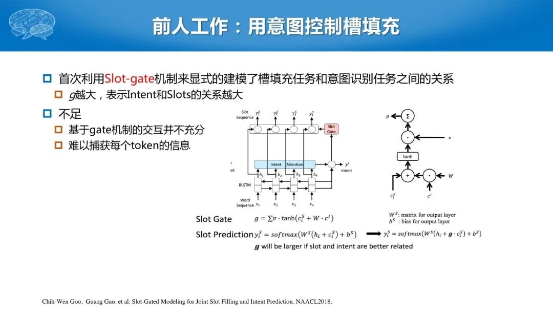 尽管前人有利用Slot-gate机制来显式地建模了槽填充任务和意图识别任务之间的关系,这种交互仍然不够充分,并且无法捕捉每个token上的具体信息,每个句子只有一个意图并进行槽的填充。