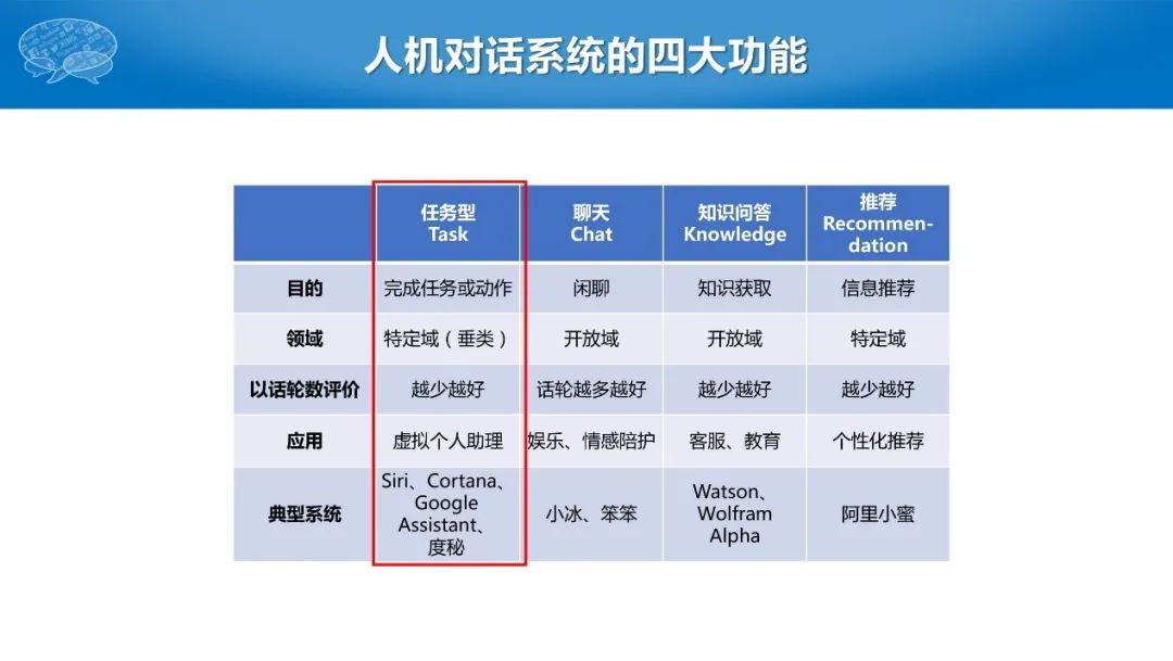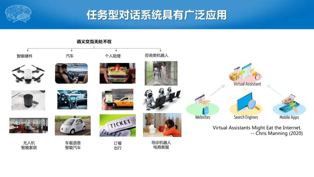 本次报告主要介绍任务型对话,即以任务或者动作为导向的对话系统。事实上,任务型对话技术在实际应用中几乎无处不在,从智能硬件、音箱、车载、个人助理到咨询类机器人等等。
