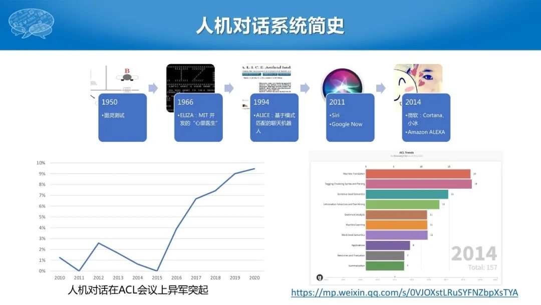 可能是因为2015年之前,语音识别作为基础问题还尚未解决,而语音如果没有转化为文本信息,自然语言的处理就无从谈起。但是2015年以后,语音识别已经达到很高水平,有时甚至超过人的识别能力,后续攻克的都是自然语言处理的问题,所以人机对话也越来越受到NLP领域的重视。