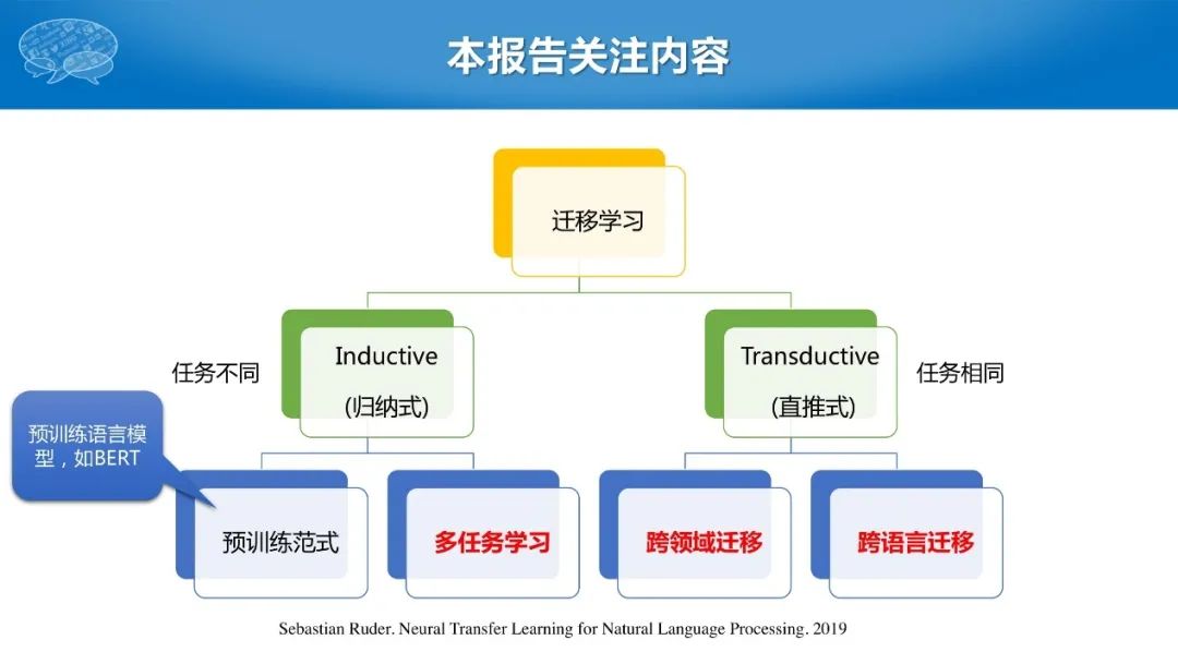 整个迁移学习可以分为两大类:第一类是归纳式,原任务和目标任务不同,例如领域或者语言的差异;另一类是直推式的,原任务和目标任务相同。
