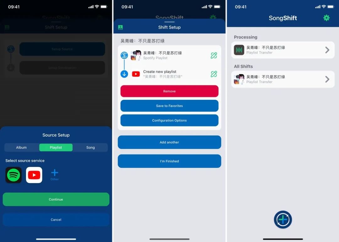 前文介绍的 TuneMyMusic 已经可以做到国际音乐平台之间的相互迁移,如果你是 iOS 用户,也可以尝试一下 SongShift 这款应用。在操作上,你只需要选择想要迁移的平台进行登录授权,随后选择歌单即可。