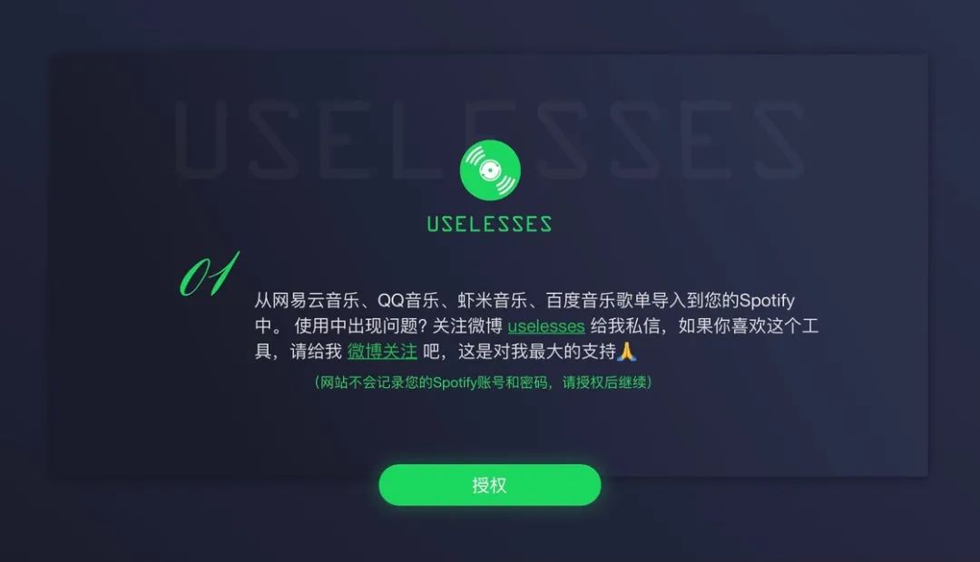 从国内主流音乐平台迁移至 Spotify 的方法其实不少,我个人比较推荐的是 Uselesses 这个在线工具。Uselesses 支持网易云音乐、QQ 音乐、虾米音乐和百度音乐,你只需要先登陆 Spotify 并为 Uselesses 授权,随后粘贴歌单链接即可开始导入。