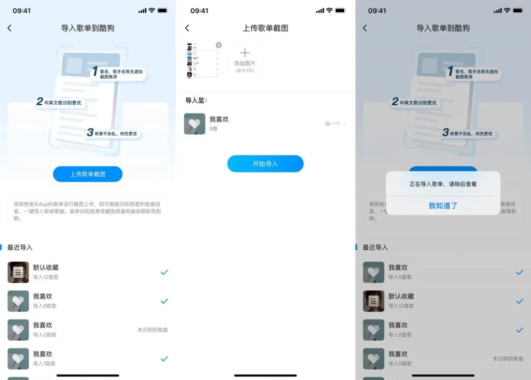酷狗音乐是四个平台中唯一支持截图导入的平台(网易云曾经支持过,但后来删掉了该功能),但它却并不支持扫描二维码导入。也就是说,如果你想把 QQ 音乐的歌单导入进酷狗音乐,只能通过分享到微博来获取链接。