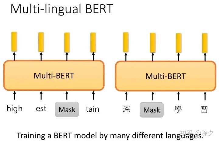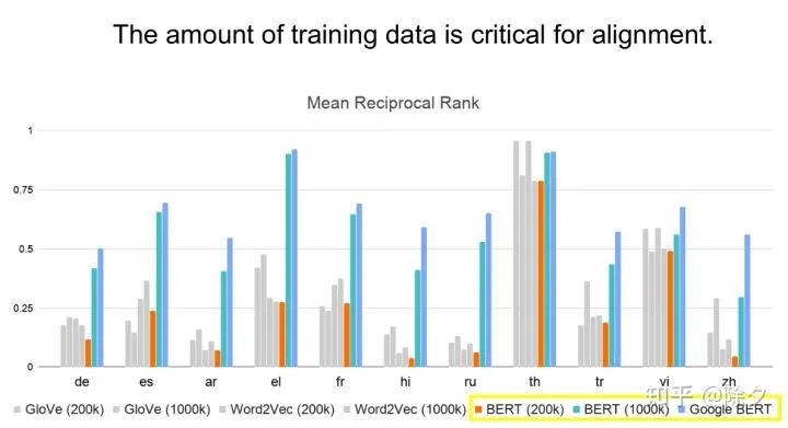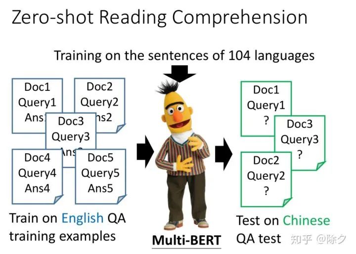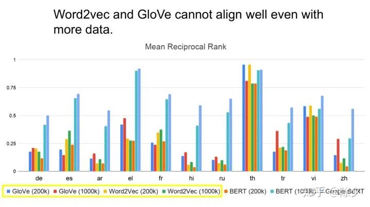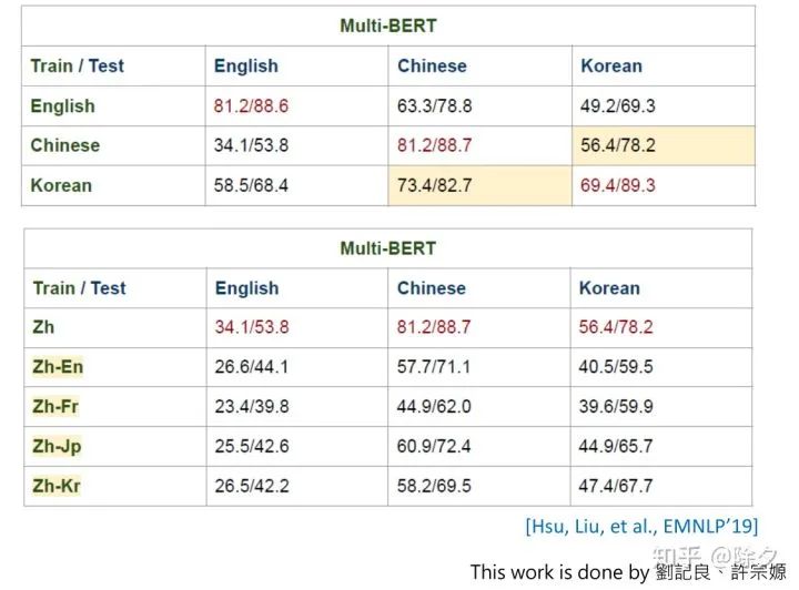我们要把某一个模型训练到英文上,然后直接测试在其它语言上。MultiBERT 会把不同的语言对齐在一起。不同语言对于 MultiBERT 似乎是无差异的,所以它能在英文上微调,中文上测试。我们有没有办法可以把不同语言信息的差异从MultiBERT中抹除掉,这样跨语言的零样本学习的效果就会变得越来越好。我们可以做一个非常简单的尝试。我们先把MultiBERT在英文上微调,然后测试在中文上。不同的是,我们在输出的时候,再加上刚才那个平均语言差异向量。结果表明,在各式各样不同的语言上,得到的结果都有不同程度的微小提升。当然,目前用的抹掉语言差异的方法还很粗糙。未来可以研究出更好的技术。 视频见(需要梯子):https://www.youtube.com/watch?v=8rDN1jUI82g&feature=youtu.be Reference• [K, et al., ICLR’20] Karthikeyan K, Zihan Wang, Stephen Mayhew, and Dan Roth. Cross-lingual ability of multilingual BERT: An empirical study, ICLR, 2020• [Pires, et al., ACL’19] Telmo Pires, Eva Schlinger, Dan Garrette, How multilingual is Multilingual BERT?, ACL, 2019• [Wu, et al., EMNLP’19] Shijie Wu, Mark Dredze, Beto, Bentz, Becas: The Surprising Cross-Lingual Effectiveness of BERT, EMNLP, 2019• [Hsu, Liu, et al., EMNLP’19] Tsung-Yuan Hsu, Chi-Liang Liu and Hung-yi Lee, "Zero-shot Reading Comprehension by Cross-lingual Transfer Learning with Multi-lingual Language Representation Model", EMNLP, 2019• [Liu, et al., arXiv’20] Chi-Liang Liu, Tsung-Yuan Hsu, Yung-Sung Chuang, Hung-Yi Lee, A Study of Cross-Lingual Ability and Language-specific Information in Multilingual BERT, arXiv, 2020• [Hu, et al., arXiv’20] Junjie Hu, Sebastian Ruder, Aditya Siddhant, Graham Neubig, Orhan Firat, Melvin Johnson, XTREME: A Massively Multilingual Multi- task Benchmark for Evaluating Cross-lingual Generalization, arXiv, 2020• [Libovický, arXiv’20] Jindřich Libovický, Rudolf Rosa, Alexander Fraser, On the Language Neutrality of Pre-trained Multilingual Representations, arXiv, 2020