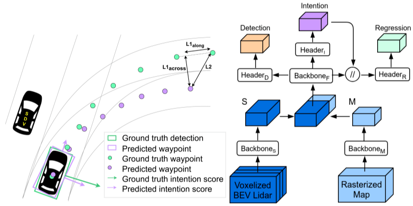 IntentNet 在 FaF 的基础上进一步加入动态高精地图作为输入来提供静态 (如车道,交叉口,交通指示牌等) 和动态(如红绿灯的状态转换)语意地图(semantic map)。包含时序信息的动态高精地图为 3D 物体检测,意图分类和轨迹预测提供了丰富的线索。
