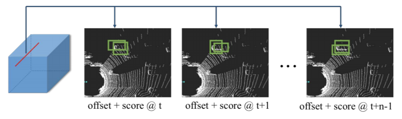 同时为了避免在单帧上使用 3D 卷积及其所引入的计算复杂度,将高度这一维作为通道(channel),从而将每一帧表示成为一个三维张量以便使用 2D 卷积处理。网络以多帧点云的鸟瞰图作为输入,直接输出当前输入 5 帧的检测结果以及未来 10 帧的预测结果(如下图所示)。