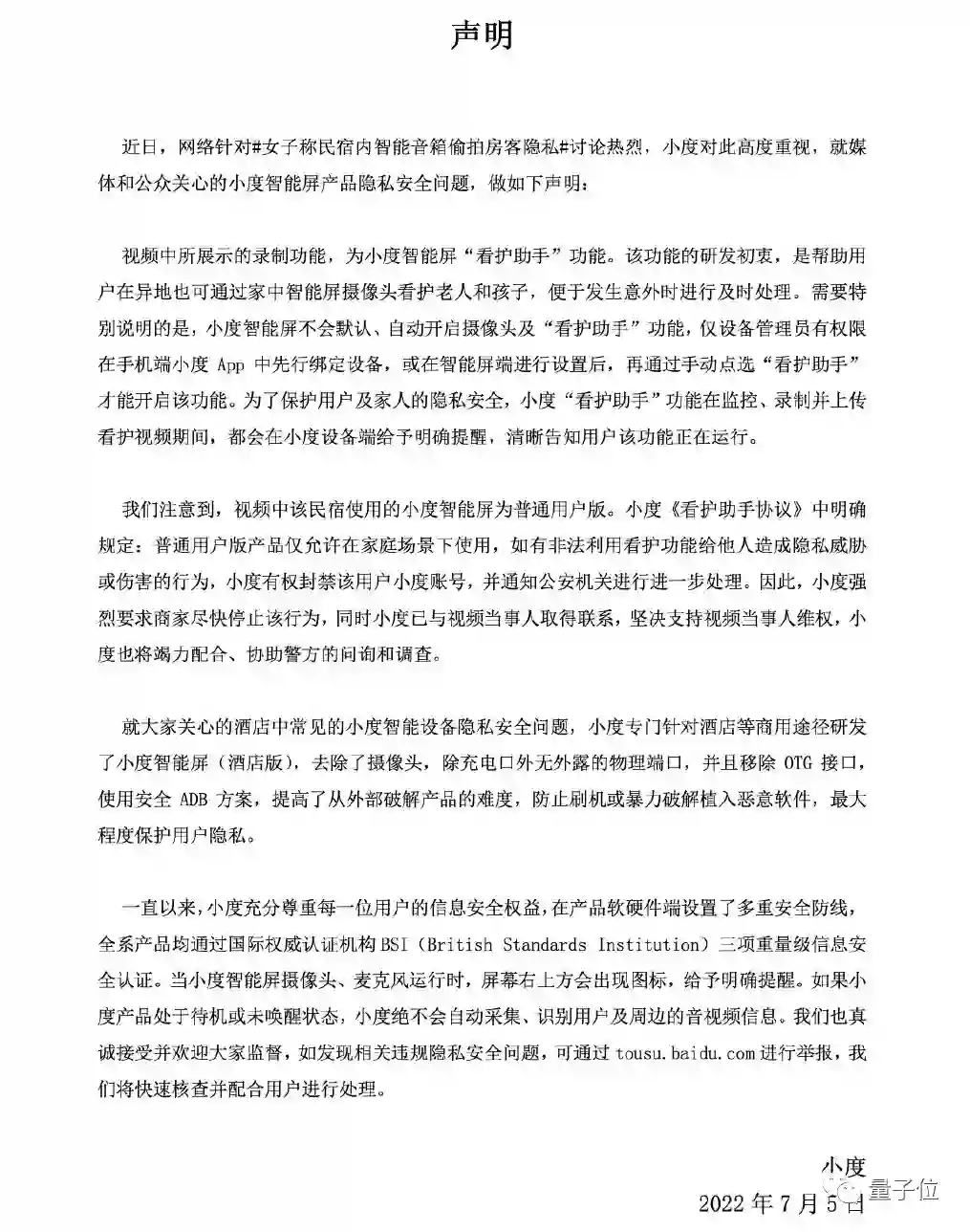 7月1日,辽宁本溪的羊女士在民宿房间里,发现小度智能音箱在看护模式下捕捉到了自己在房内走动的视频,并且里面有多段房客入住的隐私视频。