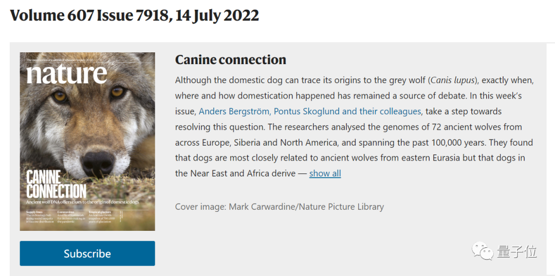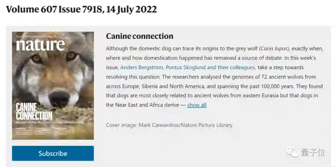 Nature最新一期的封面是英国弗朗西斯克里克研究所、德国马克斯普朗克进化人类学研究所、牛津大学等机构的大型国际联合研究团队探索犬类的野生祖先。