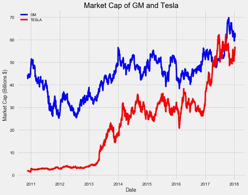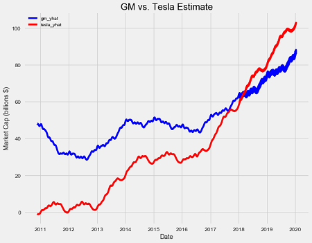 print("Tesla was valued higher than GM from {} to {}.".format(first_date.date(), last_date.date()))