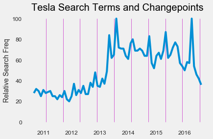 我们也可以观察由模型确定的变化点。变化点代表时间序列从上升到下降(或相反)的趋势。为了便于比较,我们可以在此时间范围内查看特斯拉的谷歌搜索趋势,看看这些变化是否一致。我们在一张图上同时画出变化点(垂直线)和搜索趋势: