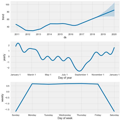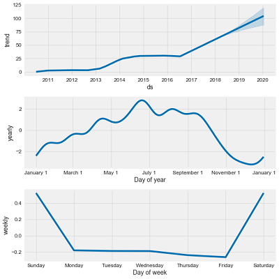 市值分析的最后一步是看整体趋势和模式。prophet 让我们可以很容易地看到整体趋势和不同维度的模式: