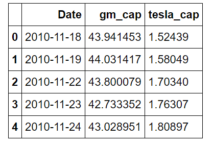 cars.rename(columns={'cap_x': 'gm_cap', 'cap_y': 'tesla_cap'}, inplace=True)