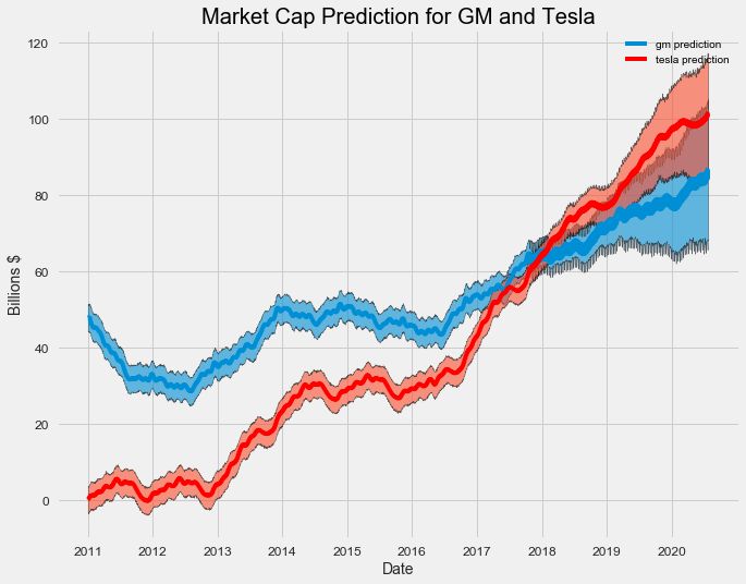 forecast = forecast.rename(columns={'gm_ds': 'Date'}).drop('tesla_ds', axis=1)