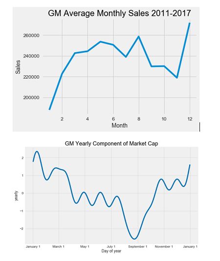 这个趋势非常明显:通用汽车的股价正在上涨并将继续上涨。年度模式很有意思,因为这似乎揭示了通用汽车的股价在年底会有所增长,但随后会缓慢下滑直到夏季。因此,我们可以尝试计算年度市值与通用汽车在此期间平均每月的销售额之间是否存在相关关系。