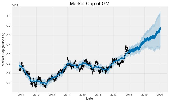 gm_prophet.plot(gm_forecast, xlabel = 'Date', ylabel = 'Market Cap (billions $)')
