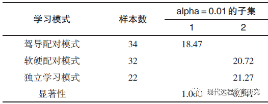 要找出具体差异,需对学习态度中的每个维度进行单因素方差分析。在自信心、享受度和价值观三方面,方差同质性检验的F值均不显著,p>0.05,可进行方差分析。单因素方差分析结果显示,不同学习模式下的学生在自信心和享受度上都存在显著差异,p<0.05,而在价值观上无显著差异,p>0.05。对存在显著差异的自信心和享受度两个维度分别采用SNK事后检验法进行两两比较,统计结果(见表8和表9)表明,独立学习模式下学生的自信心明显高于驾导配对模式下的学生,而软硬配对模式下的学生的自信心处于两者之间;独立学习模式下学生的享受度明显高于两种配对学习模式,两种配对模式下学生的享受度没有显著差异。
