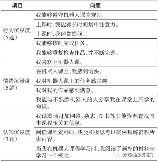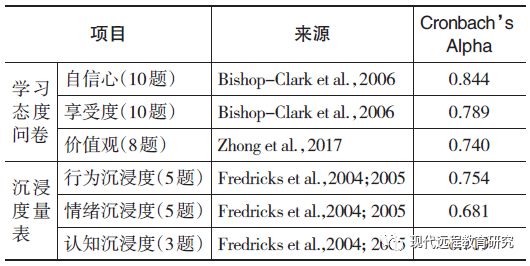 学习沉浸度问卷旨在调查学生在课堂学习过程中的投入程度,为5点李克特量表。学习沉浸度主要体现在行为沉浸度、情绪沉浸度和认知沉浸度三方面。其中,行为沉浸度主要关注学生在课堂中的努力程度、注意力和任务参与度;情绪沉浸度则是调查学生的情感参与和认可程度,包括积极和消极的情绪;认知沉浸度是调查学生为解决学习难题使用的策略,认可掌握目标的学生更有可能使用深层次的策略。量表来源和信度详见表5。表6显示了学习沉浸度问卷中行为沉浸度、情绪沉浸度和认知沉浸度三维度上的具体问题。