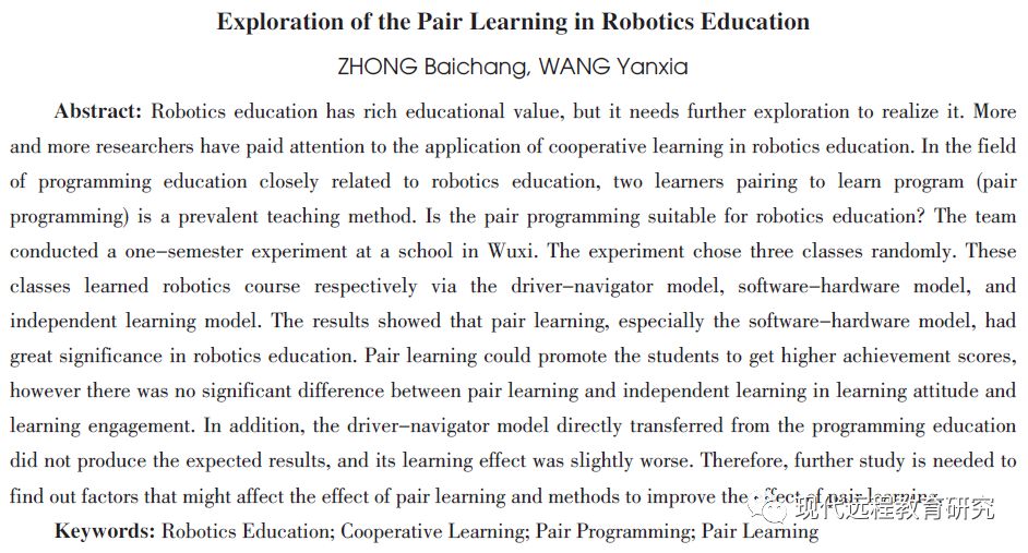 引用:钟柏昌,王艳霞(2018).配对学习模式在机器人教育中的有效性[J].现代远程教育研究,(3):66-74.
