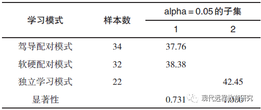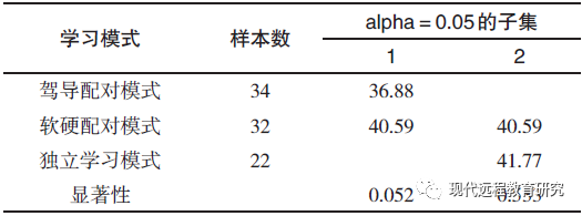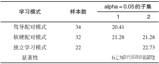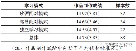 第一个研究问题是探索三种学习模式下学生的作品制作质量是否有差异。为此,我们以学习模式为自变量,作品制作测试成绩为因变量,进行了单因素方差分析。数据显示三种学习模式下学生的作品制作质量没有明显差异,F(2,85)=0.10,p>0.05。但从三个班级成绩的平均分(见表7)中可以看出,使用软硬配对模式班级的平均分要略高于其他两个班级。