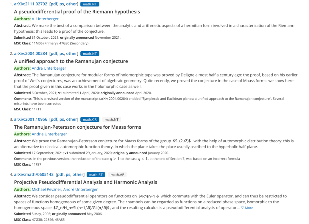 Andre Unterberger 对黎曼猜想涉及到的厄米特形式(hermitian form)的分析和算术部分进行了详尽的比较,从而证明了该猜想。