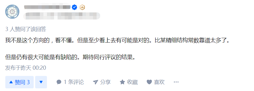 这位匿名用户的观点也得到了其他人的附议。「至少看上去有可能是对的,比某精细结构常数要靠谱得多。仍有很大可能存在缺陷,还是期待同行评议的结果。」有用户这样表示。