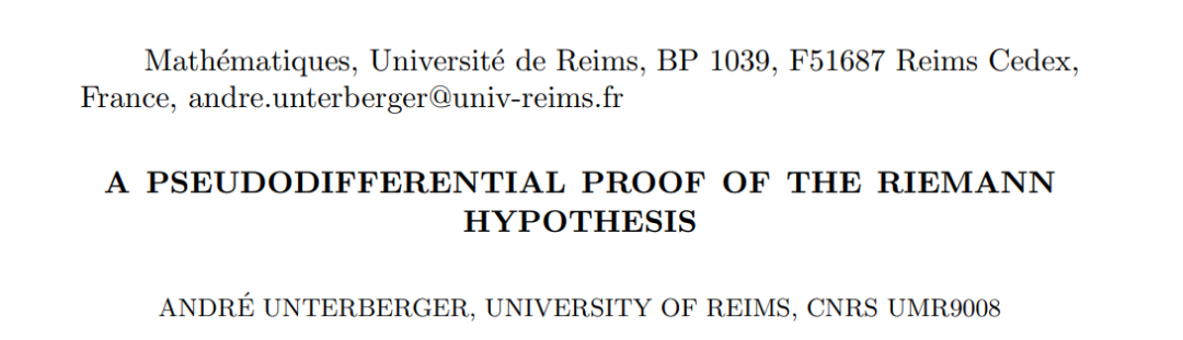 10 月 31 日,兰斯大学的 Andre Unterberger 在 arXiv 上传论文《A pseudodifferential proof of the Riemann hypothesis》。