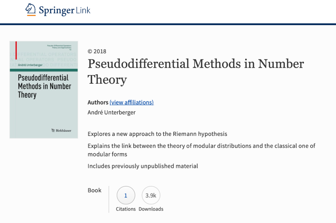 这篇论文的参考来源也是 Andre Unterberger 自己在 2018 年出版的一本关于数论的书籍《Pseudodifferential methods in number theory》。书籍介绍中就提到了「探索一种证明黎曼猜想的新方法」。