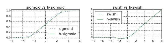Sigmoid系列: Sigmoid、swish、h-sigmoid、h-swish;sigmoid对低性能的硬件来说非常不友好,因为涉及到大量的exp指数运算和除法运算,于是有研究人员针对此专门设计了近似的硬件友好的函数h-sigmoid和h-swish函数,这里的h指的就是hardware的意思: