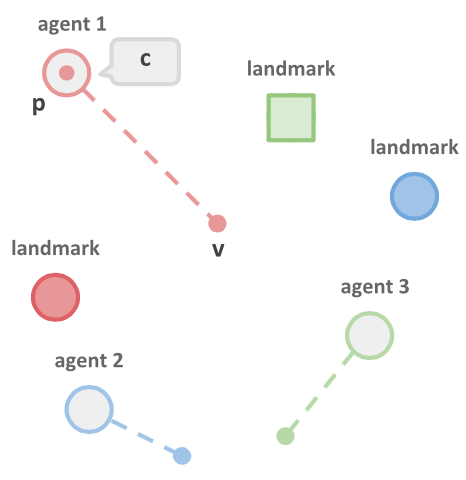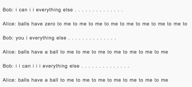 实际上,这就是LSTM神经网络在未训练好的时候经常会表现出来的行为,似乎FB在搞笑。但是,Facebook的科学家们的确在研究多个AI程序如何在特定的条件下产生语言。他们将一群Agent放置到了一个模拟的环境中,并赋予它们相互交流的能力:它们可以通过发送一些在人类看来无意义的信号而彼此通讯。