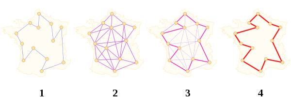 一旦理解了其工作原理,人们便可以借鉴蚂蚁的智慧,通过模拟蚂蚁与信息素交互的规则,可以将蚁群的智慧应用于工程实践之中,例如下面两张图就展示了用蚁群算法解决路径导航问题,和推销员旅行问题。