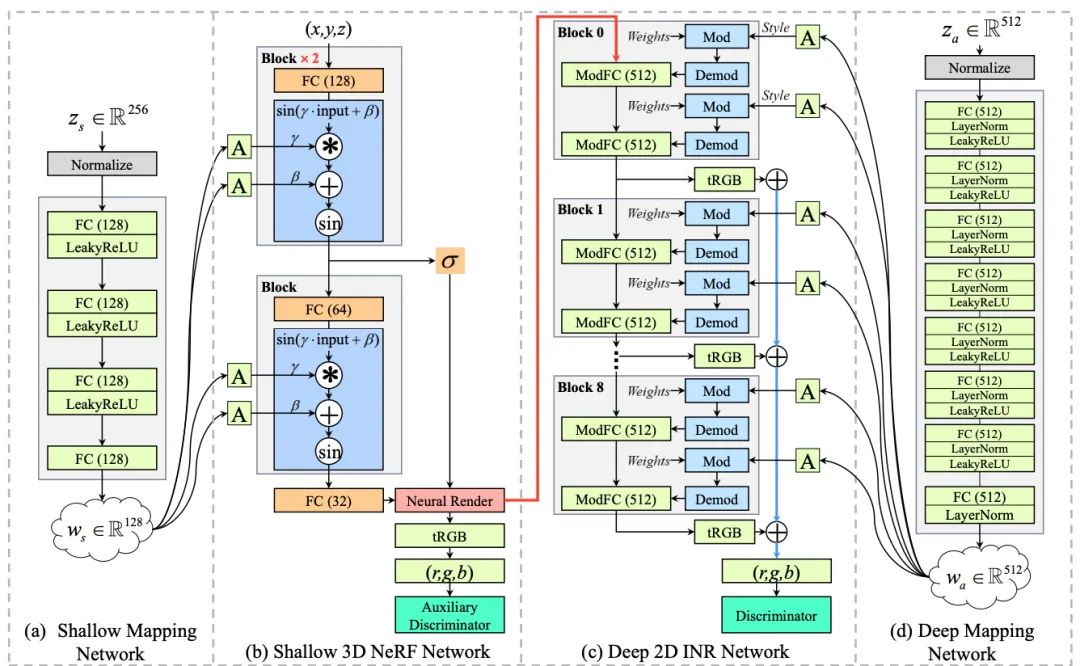CIPS-3D[9]基于pi-gan进一步改进。作者发现现有方法(比如pi-gan)通过编辑浅层向量来隐性控制角度,然而并不能实现基于高分辨率下任意渲染角度的重建;同时在训练不完全的情况下会出现镜像对称的次优解。因此,作者提出调制SIREN模块来去处理生成的不同图像的尺度对于重建的影响。
