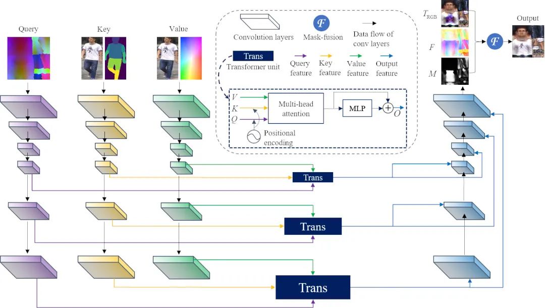 具体来说,使用预计算色彩图作为query,图上每个像素对应于三维空间下的一个顶点;使用输入图像作为value;使用二维组件分割图(2D part segmentation map)作为映射图像到UV空间的载体。作者同时使用一个混合蒙版来合并texture flow与RGB色彩来生成效果更好的色彩预测结果。这里我们附上Texformer的结构图供大家参考。