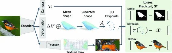 1) 先对单图片中的目标物体进行建模,直接取得其三维形体(template), 之后再使用另一个模型去上色并处理光照。整个流程不是一个端到端的流程(这里并不是说不能做到单模型统一,只是目前没论文这样做),需要分开训练。
