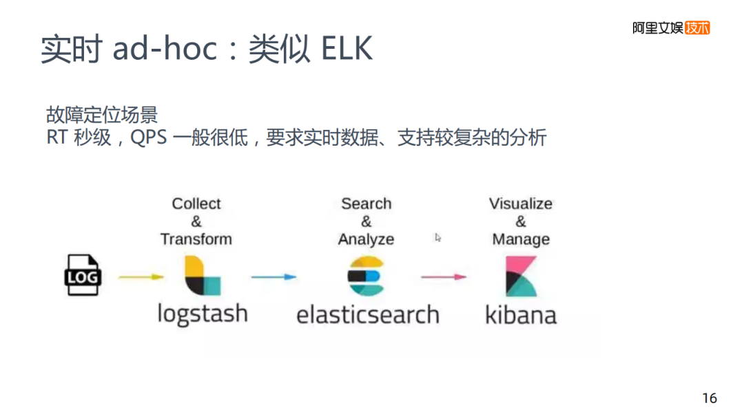 比如如何去定位查找错误,查找机房存在问题,这都是一些比较常见的场景。这个场景对RT的要求较好。RT和QPS方面没有API要求那么高,它的用户人数也不是那么多,没有一些高并发的场景,但是对数据的实时性和分析的复杂性还是存在要求的,这种的预计算也不大可能去满足,为解决这类问题,我们做的是一个类似ELK的方案。