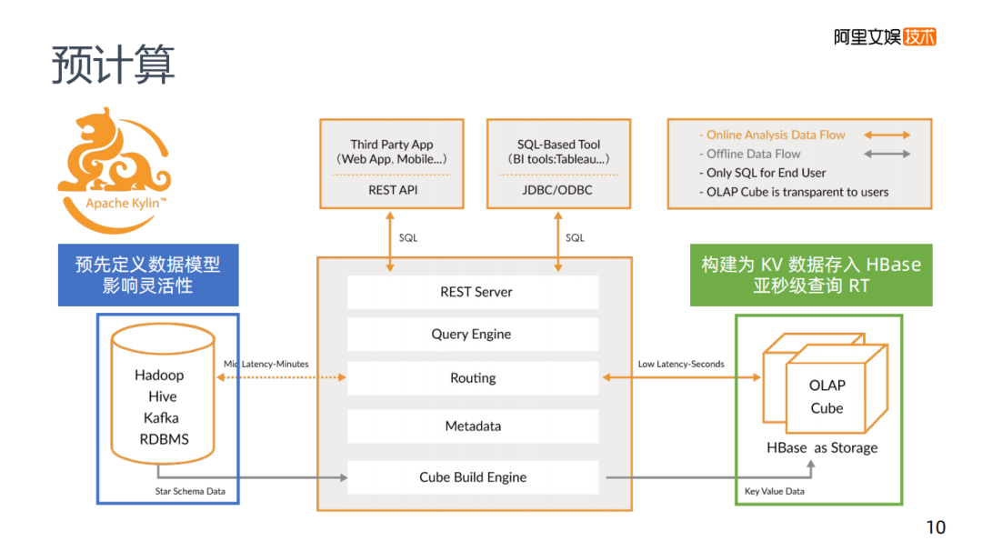 讲到预计算,就不得不提到Apache Kylin,它的架构如图,需要预先定义查询的内容。