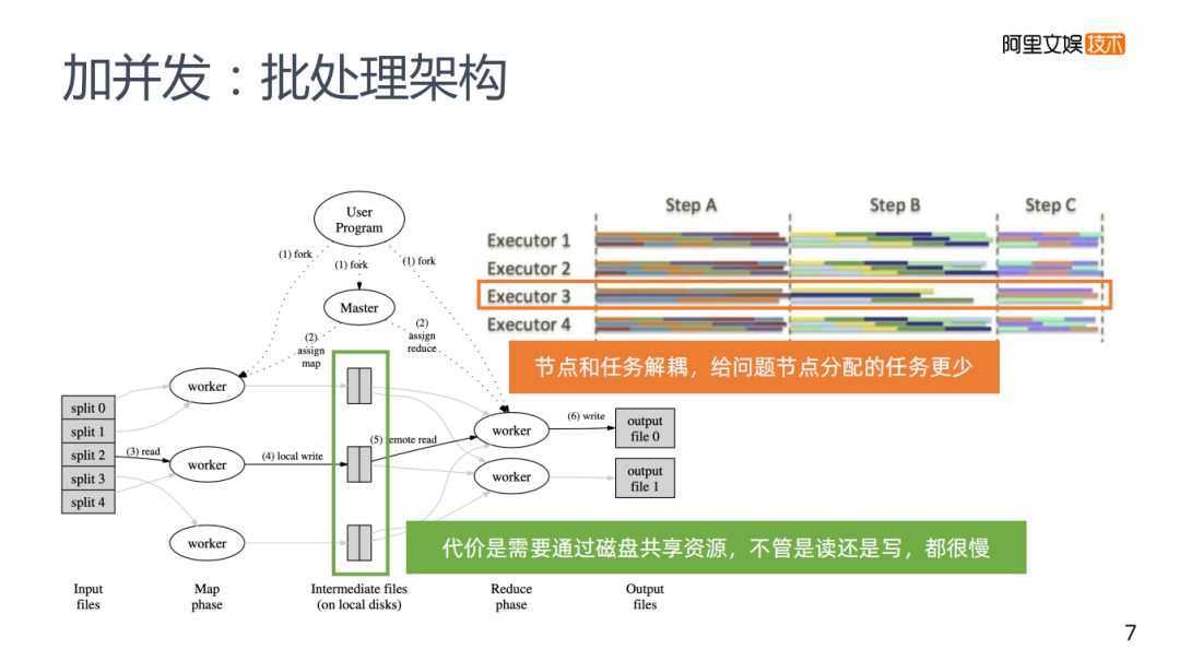 批处理架构需要节点和任务去进行解耦,解耦的代价是,需要共享资源,势必会带来写磁盘,不管是读磁盘还是写磁盘,相比MPP的通信方式来说显然会更慢。