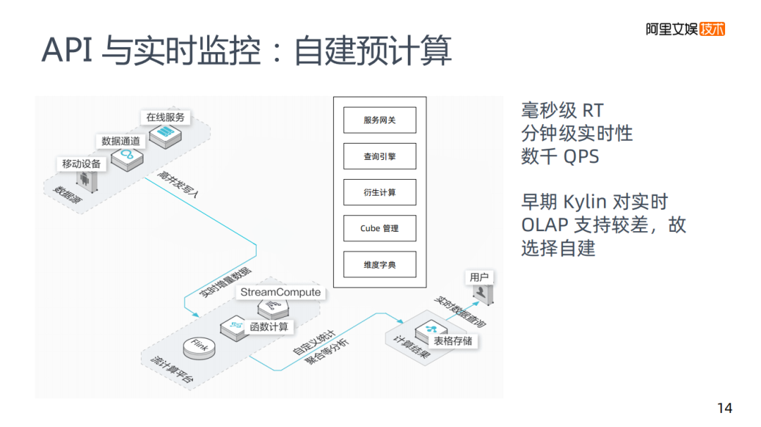 第一类场景是API与实时监控:API是系统访问,比如在我们的推荐系统里,需要用到一些实时特征,如用户截至目前曝光了多少次,会存在非常大的QPS,以及对RT要求很高,数据也要有分钟级的实时性要求。API与实时监控,目前在优酷是自建的预计算系统。