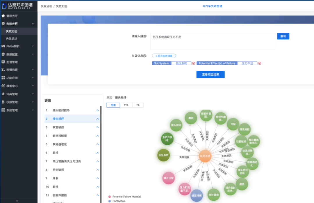 用户通过输入故障/失效现象的描述,后台连接传感器或日志内记录的故障错误信息,通过语义理解,从知识图谱中自动找到最匹配的失效原因,并展示出解决方法和改善措施,协助现场工程师进行失效归因分析,从而更快速地处理故障。