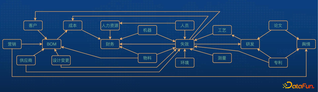 上图展示了一个已构建的知识图谱的简化版schema,可以看出产品、设备、研发、生产、管理、售后、售前等各个环节都与失效有关。除了常见的“人机料法环测”等主要维度,故障和失效还与人力资源、成本,以及BOM数据产生关联;而BOM数据则与设计变更、供应商、客户、营销等因素可产生进一步的关联。在研发端,研发的相关知识,包括论文、专利、舆情等,以及竞品相关的说明文档等,都可以与故障和失效进行关联,从而全方位地完善FMEA知识图谱中的核心知识和基础知识,实现失效知识的融会贯通。