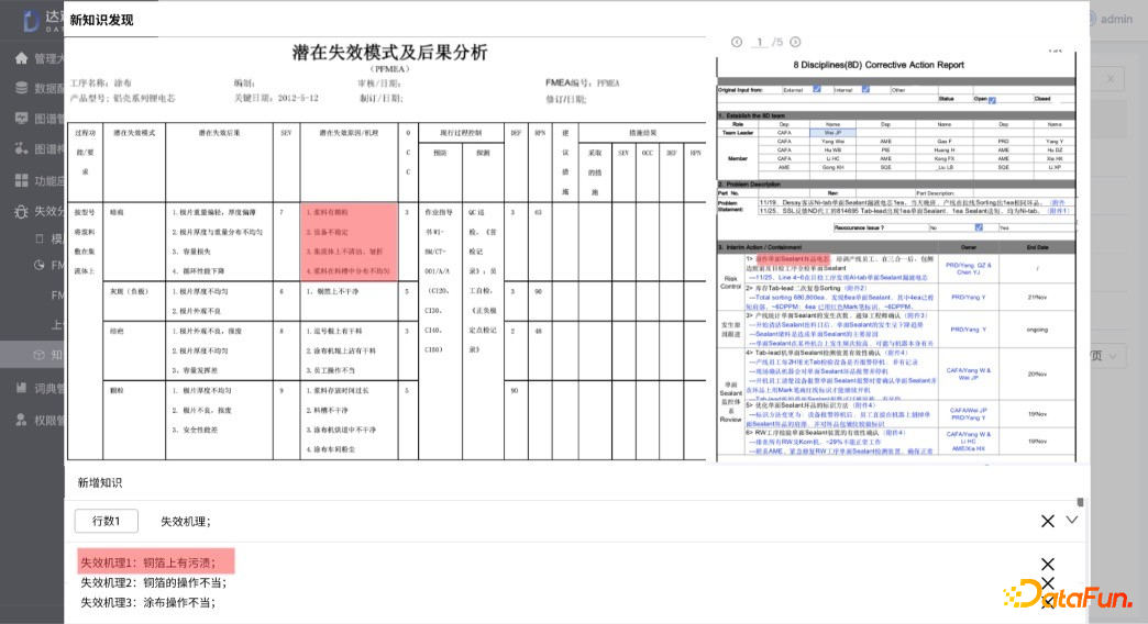 因此,利用平台中的FMEA辅助制作工具,基于知识图谱辅助条件筛选,可自动从已构建的知识图谱中生成FMEA;平台支持DFMEA(新产品)、PFMEA(新工艺)、MFMEA(新设备)等多种类型的FMEA;工程师可直接在收集整理好的FMEA上进行编辑,可大大缩短FMEA的制作周期,提升了效率,同时实现了对历史经验更全面、更充分的利用。
