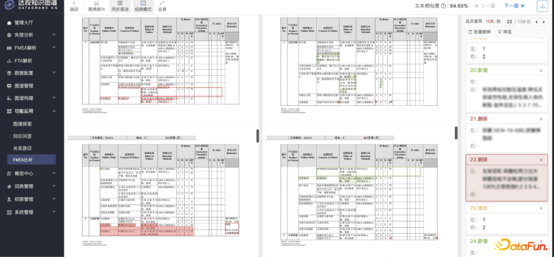 FMEA版本管理和智能比对,包括FMEA文档级版本比对和FMEA条目级版本比对两部分。在FMEA查询结果列表下方显示最新FMEA版本文件,点击后展示当前FMEA文件所有历史版本,和前序各版本进行文档级比对,实现同一个产品零部件FMEA在不同版本的差异化比对;在FMEA查询结果列表中选择待比对故障模式,点击对应条目版本差异化比对,按表单形式展示不同版本该比对条目的差异点并高亮显示,实现同一个产品/部件FMEA中故障模式的差异化比对;进而可实现知识的融合,以及相同或相似的失效模式的整合和比对。
