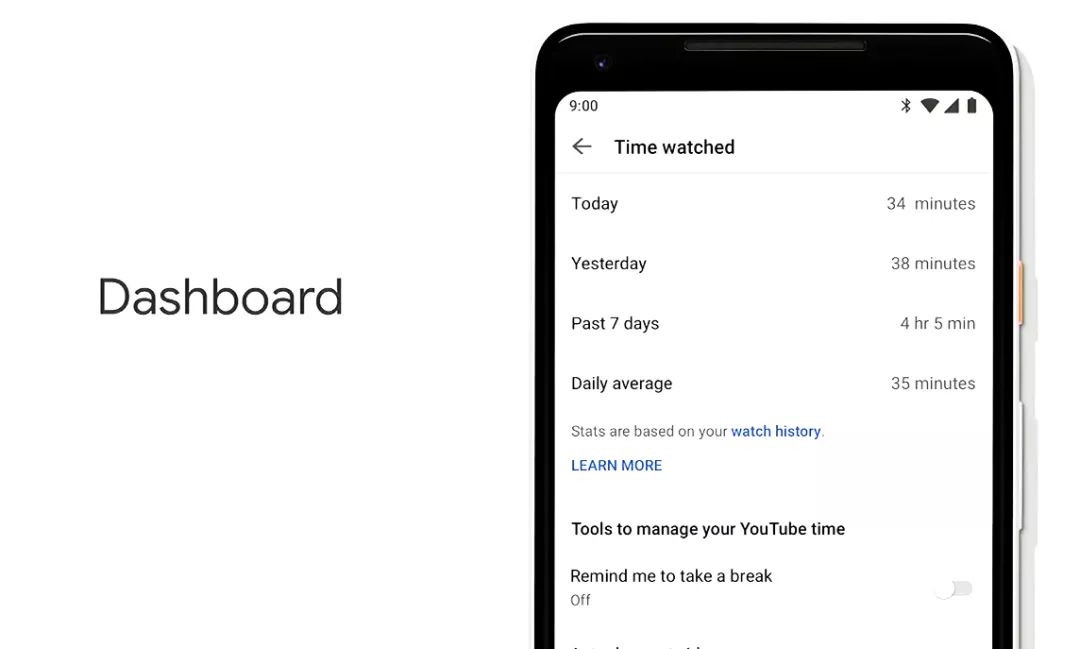 Dashboard 仪表盘功能并不是 Android P 操作系统独占功能,第三方开发者的应用程序也能够深度接入系统的仪表板功能,为用户提供更多有关自己手机和应用程序的相关数据。举例说,你在手机上看视频花了很多时间,那么 YouTube 应用程序会通知用户看视频花的时间,然后提醒你时候需要休息一下。