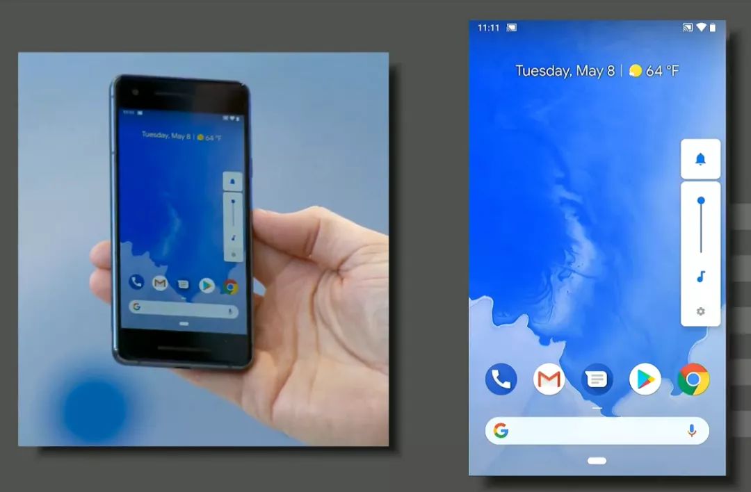 谷歌还展示了之前在 Android P 开发者预览版中已经出现的垂直音量控制界面,这一界面已经经过全新设计简化,声称可以更好的管理音量。