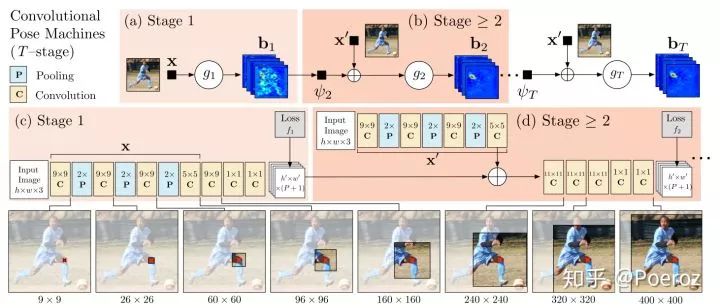 CPM是一个multi-stage的结构,如下图所示。每个stage的输入是原始图片特征和上一个阶段输出的belief map,这个belief map可以认为是之前的stage学到的spatial context的一个encoding。这样当前stage根据这两种信息继续通过卷积层提取信息,并产生新的belief map,这样经过不断的refinement,最后产生一个较为准确的结果。