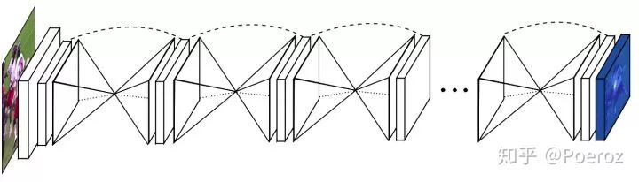 Hourglass也是一种multi-stage的结构,是2016年的一个工作,与CPM相比更加简洁一些,如下图所示。这个网络由多个堆叠起来的Hourglass module组成(因为网络长的很像多个堆叠起来的沙漏)。每个Hourglass module的结构都包含一个bottom-up过程和一个top-down过程,前者通过卷积和pooling将图片从高分辨率降到低分辨率,后者通过upsample将图片从低分辨率恢复到高分辨率。