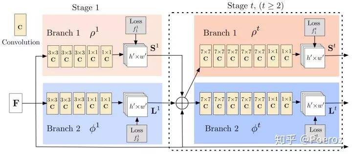 对于生成heatmap和PAF的部分,使用了下图所示的网络结构。首先 是初始的feature map,网络的输出是heatmap和PAF,分别用