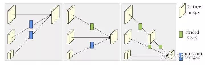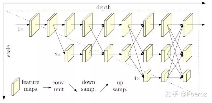 此外非常重要的一点,从图中我们也可以看到,为了使不同分辨率之间的信息融合在一起,从而获得包含多个分辨率下信息的feature map,在相邻的stage之间(每添加一个新的低分辨率分支时视为一个新stage的开始)加了fusion结构,fusion直观上类似在两边的feature maps之间加了一个fc层,下采样通过多个 卷积,上采样就是简单的nearest neighbor upsampling。这里的融合就是简单的累加。通过多次fusion,最后得到的feature map包含的信息是非常丰富的,也因此HRNet达到了很好的效果。
